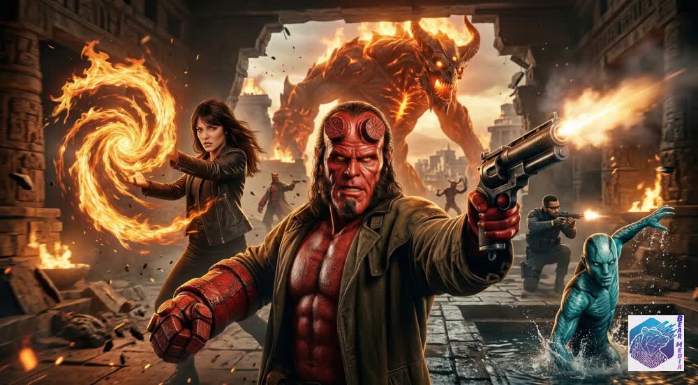 Below the crumbling altars, the nightmare spills outward. An endless tide of shadow-spawn and cultists, driven by apocalyptic zealotry, swarms the ruined steps of the scorched earth. They do not see a tactical strike force; they see the architects of their dark millennium refusing their roles. The clash of gunfire, the crackle of aquatic energy, and the roar of the advancing horde force the inevitable. Hellboy cannot protect his adopted family by simply being a man. To save the world he loves, he must wade into the hell he was meant to rule.