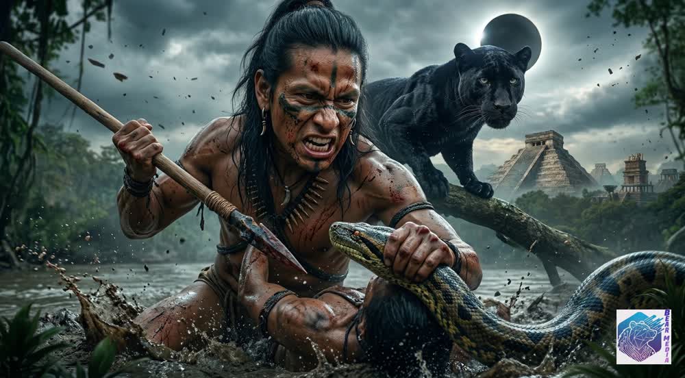 The silence of the riverbend is shattered by the rhythmic, terrifying beat of pursuing paddles. The stone cities have sent their elite, painted hunters downriver, desperate to appease the dying sun with fresh captives. The jungle itself seems to turn against the fugitives, the massive coils of a waking serpent thrashing the water into a violent churn. “Scouts from the burning capital report that the shadow across the sun has triggered a massive, frenzied purge along the sacred waterways.” The arrows begin to rain from the dense canopy, hissing like vipers before striking the wooden hull of the fleeing canoe.