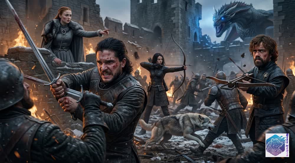 The courtyard dissolves into a breathless, suffocating melee of fire and frost. Jon cuts through the freezing horde, his blade screaming against shattered ice weapons, every swing fueled by raw, terrified determination. Above him, the undead dragon unleashes a shockwave of frozen fire, illuminating the carnage before being swallowed by the relentless winter storm. Sansa and Tyrion navigate the crumbling crypts, attempting to shield the vulnerable from the horrors bleeding through the ancient stone. It is a chaotic, desperate stand against extinction, where every breath of cold air feels like a blade against the throat.