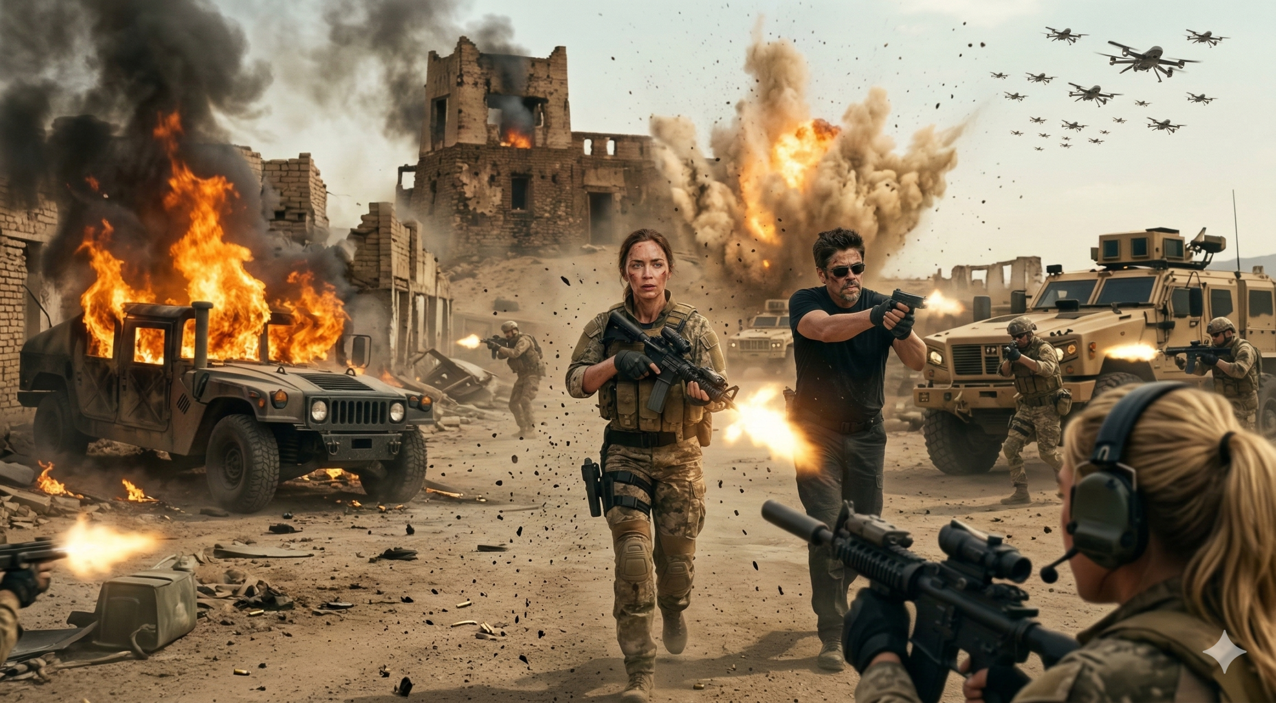 When the dust finally settles over the burning wreckage of the convoy, the border is a graveyard of twisted metal and silent bodies. Kate stands alone near a destroyed armored vehicle, her rifle lowered, chest heaving in the quiet aftermath. The silhouette of Alejandro stands against the blinding sun on the ridge above, a ghost fading back into the landscape. Kate does not call out to him or attempt to arrest the man she knows has crossed every line. She simply lowers her head, recognizing that the war is won not by the righteous, but by those willing to be the most ruthless.