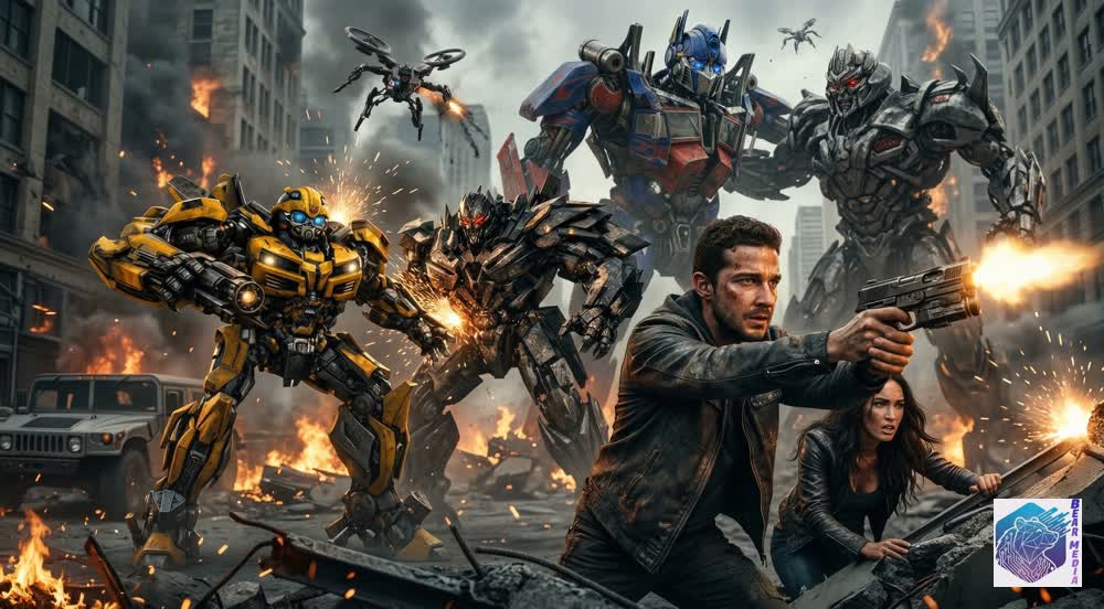 The city erupts into a blinding, torrential tempest of plasma fire, shattering glass, and the agonizing shriek of tearing metal. In the heart of the maelstrom, the human survivors are pushed to the absolute edge of their endurance. It is here, in the deafening chaos, that the bond between man and machine is brutally tested. Bumblebee provides a kinetic, yellow blur of covering fire, intercepting missiles meant for the fleeing crowds, while Sam and Mikaela sprint through the crossfire. Sam does not fight the warlord directly; he uses his specialized alien rifle to blind the advancing foot soldiers, holding the line in the dust while Optimus Prime descends from the smoke, his blue optics locking onto the tyrant in a seismic collision that rattles the earth to its core.