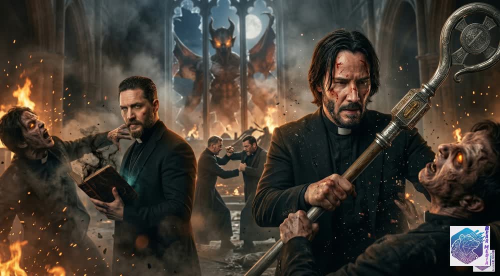 The sky over the cathedral does not hold the light; it swallows it, turning the heavens into a bruised tapestry of smoke and ancient, winged malice. In the shadow of a faith that has been pushed to the precipice, two men stand amidst the headstones of a world that is beginning to bleed… A claustrophobic, bone-chilling theater of spiritual war where the bells no longer call the faithful to prayer, but warn the living of the tide.