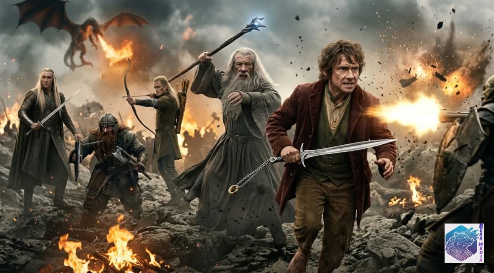 And yet, amid the roars of beasts and the shattering of shields, a different kind of strength reveals itself. Not the strength of magic or kings, but the quiet resolve of a halfling tightening his grip on a glowing sword. As lightning cascades down the slopes of Erebor, illuminating the gold ring resting against his chest, the true turning point of the age is forged. It is a silent vow made in the eye of the storm: even the smallest of hands can hold back the night.