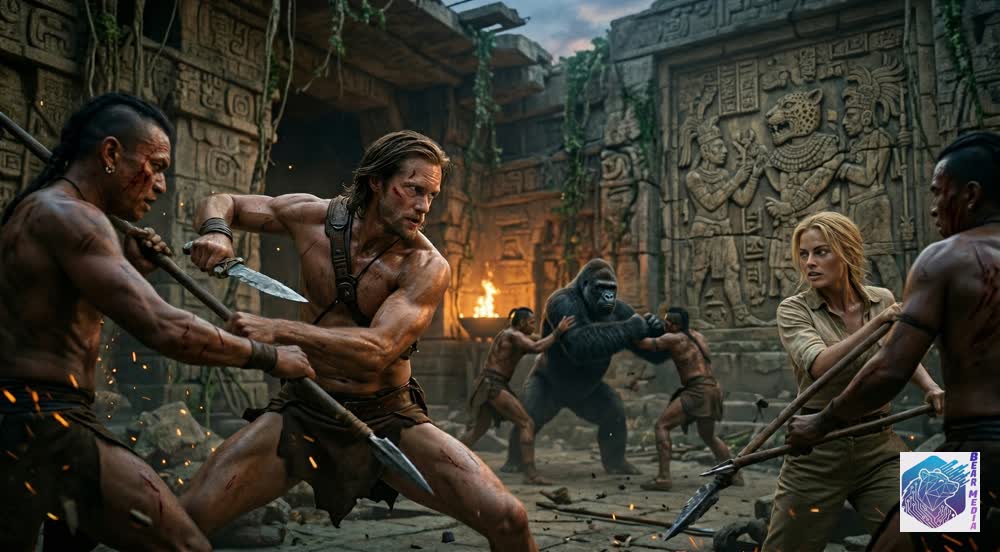 The steps of the great pyramid become a battlefield of mythic proportions. A lion’s roar shatters the humid air, syncing with the war cries of great apes charging down the crumbling ruins. Tarzan leads the brutal, chaotic ballet of survival, his blade flashing against the invaders while Jane holds the perimeter beneath the golden, fractured sky. It is a terrifying clash of nature and greed, where every falling leaf is mirrored by a drop of spilled blood, and the very ground shakes with the weight of trampling elephants and desperate men.