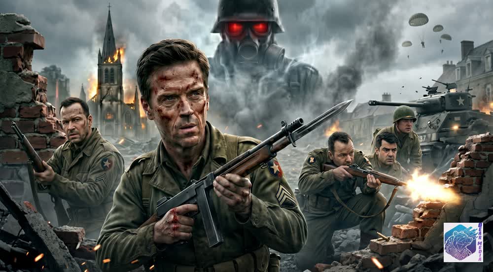 The sky over the fractured French countryside bleeds in hues of ash and ember, torn apart by the relentless descent of silk canopies and artillery fire. In what critics are already calling a bone-chilling and visually spectacular triumph of alternate history, the familiar European theater descends into absolute nightmare. A cathedral spire burns like a desperate beacon in the distance, casting long, frantic shadows over the shattered bricks and scattered debris. As the deafening roar of armored treads crushes the remnants of a peaceful village, the men of the airborne infantry find themselves looking upβnot just at falling comrades, but at a gargantuan terror breathing from the very smoke of war.