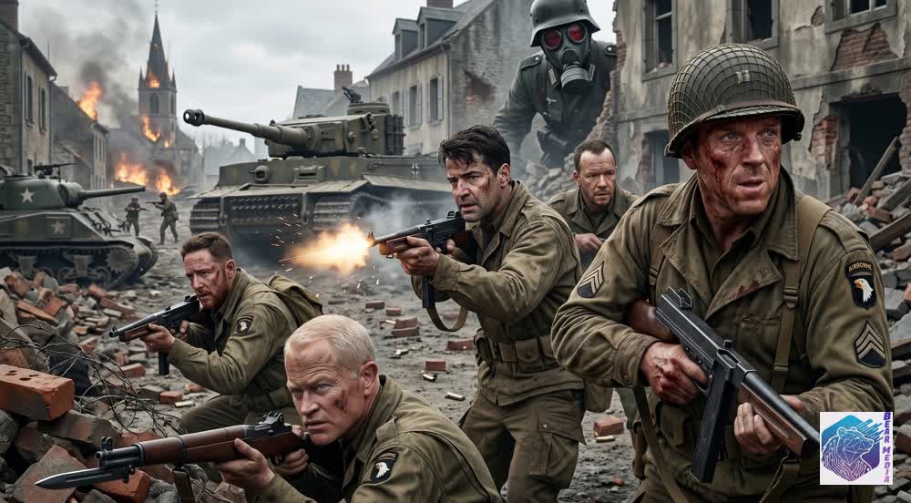 The ash of a broken Europe falls like snow over the fractured cobblestones, painting the afternoon in suffocating hues of gray and ember. In what critics are already calling a visually terrifying and emotionally shattering reimagining of history’s darkest hour, the familiar ruins of the French countryside have become the staging ground for a nightmare. A cathedral spire burns in the distance, casting desperate, flickering light over a battlefield where tactical manuals have been rendered utterly useless. As the deafening, metallic shriek of a Tiger tank grinds through the debris, the men of the airborne infantry find themselves pinned not just by armor, but by a gargantuan, mechanical horror rising from the very smoke of the Third Reich.