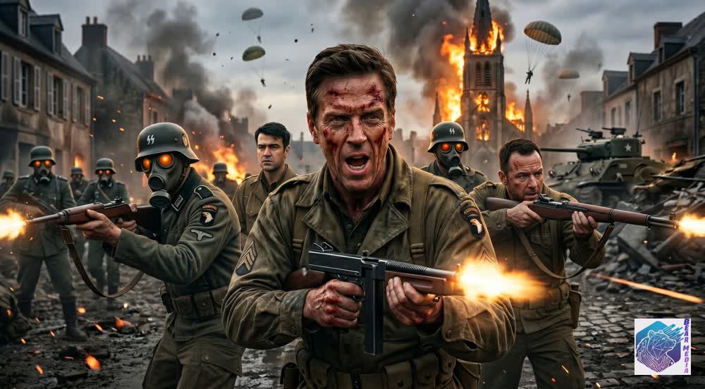 The architecture of the town itself feels like a trap, the collapsing cathedral a dying titan watching their final stand… A relentless, supernatural storm pushes through the cobblestones, turning every shadow into a suffocating threat… The evening broadcasts might announce Allied Paratroopers Secure French Stronghold, but down in the soot and the screaming, it is a suffocating struggle against a terrifying anomaly, an enemy that bleeds shadow and exhales toxic fear…
