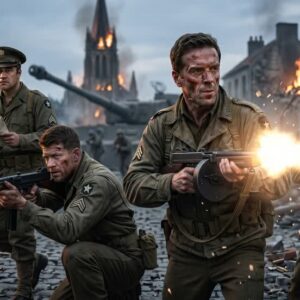 The architecture of the town itself feels like a trap, dwarfed by the colossal, masked phantom that dominates the heavens… A relentless, mechanized storm of steel and hatred pushes through the broken streets, turning every shadow into a suffocating threat… The evening broadcasts might bravely declare Allied Airborne Drops Behind Enemy Lines, but down in the soot and the screaming, it is a desperate struggle against an entity that feeds on their terror…